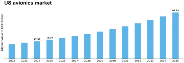 As per Market Research Future analysis, the US avionics market Size was estimated at 17.53 USD Billion in 2024. The US avionics market is projected to grow from 19.16 USD Billion in 2025 to 46.63 USD Billion by 2035, exhibiting a compound annual growth rate (CAGR) of 9% during the forecast period 2025 - 2035.